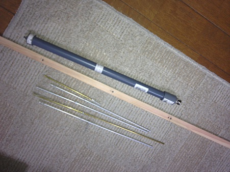 最初は6エレにしようかと思いましたが、ブームの長さが80cmを超えてしまうので、5エレにしました。「ハンディ用」ということで、エレメントを全て取り外せるようにし、持ち運べるように考えました。ラジエーター(輻射器)の上の部分はギボシ端子を使って取り外せるようにし、下の部分は塩ビ管に格納してしまいました。
