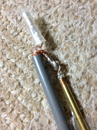 同軸の先端を1cm~2cmくらい剥きます。芯線は半田メッキして、ギボシ端子のメスをつけ、よくかしめます。編組線の方は、半分~三分の一くらいをまとめて半田メッキします。それを、切っておいた真鍮パイプの穴に入れて、半田付けします。うまく半田付け出来ないという方は、ラジオペンチとニッパでかしめるようにしてしまっても構いません(やると分かりますが、真鍮パイプはニッパでは切れません)。下のエレメントが付いたら、同軸にセロテープで固定します。このとき、ある程度同軸と離して下さい。