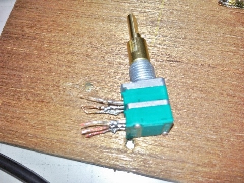 基板をひっくり返して、半田付けされているボリュームのピンを、吸い取り線などを使って丁寧に外します。半田が古いので、予備半田をしてやるとうまく外れます(まるで呼び水のようなので『呼び半田』と最初変換していましたが、検索しても引っかからないのを見ると一般的じゃ無いみたいですね、hihi)。