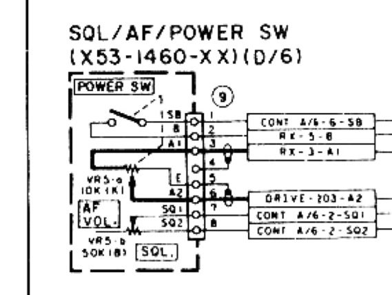 ボリュームのタイプですが、答えを言ってしまうと「2軸2連」という形です。「2連」というのは「1つのボリュームで2つの抵抗を操作できるもの」という意味(『1軸2連』と言ったらステレオアンプのボリュームをイメージするとわかりやすいです)になります。今回は「2軸2連」なので、「内側と外側で別々の操作をして(2軸)、おのおの1つずつ、計2つの抵抗を操作(2連)」ということです(独自解釈あり、間違ってたらごめんなさい!)。また、AF/SQLのボリュームには、電源の入・切のための「プッシュオン・プッシュオフ スイッチ」と呼ばれるスイッチがついていますので、これを念頭に置いておきましょう。